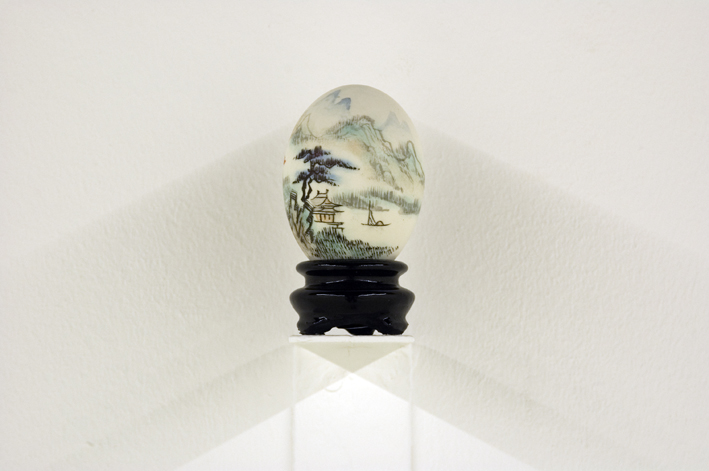 Ovo 2009 Installation. Hand painted chinese landscape on egg. Unknown artist. Purchased in New York's Chinatown for one US Dollar. Sold for one dollar. 8 x 4 x 4 cm
