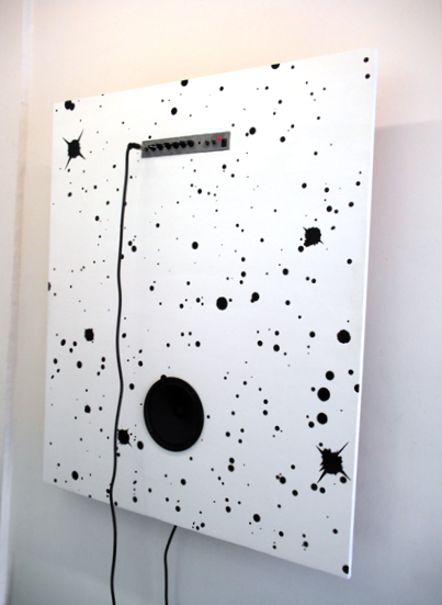 Flat Power Spectral Density 2009. Sonic painting, sound. Guitar amplifier, sound speaker, cables, plywood, and acrylic paint