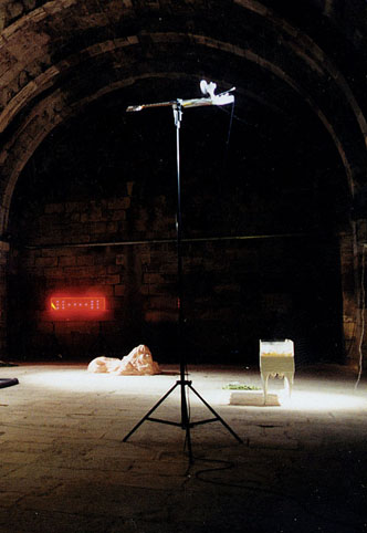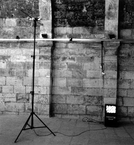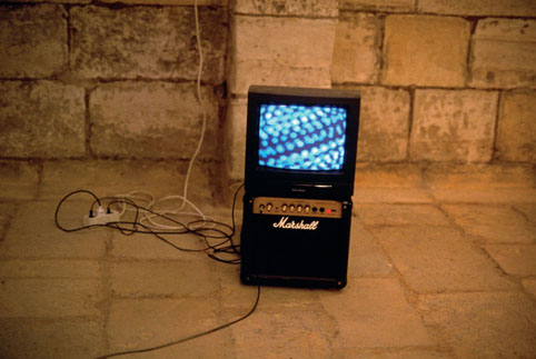 (Carlos Roque + Rui Valério). Installation, sculpture, sound. 1995. Electric guitar, fan, nylon string, tripod, monitor, VCR and guitar amplifier. Variable dimensions (400 x 100 x 150 cm).