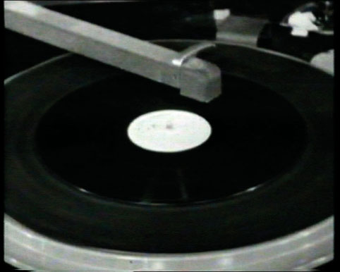 This video shows a 4 seconds loop of an old turntable going on and on at the same vinyl record line with no sound being produced.