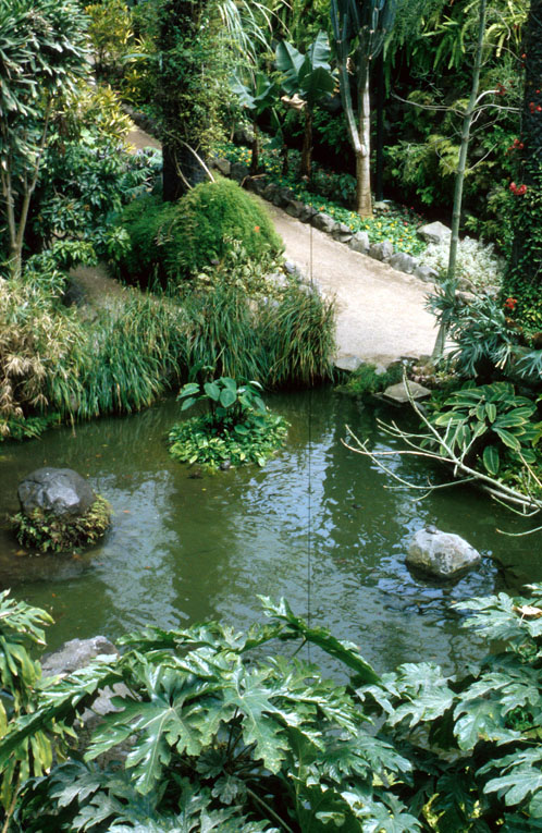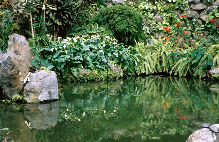 There is a small lake right in the middle of the green house and a glass ceiling