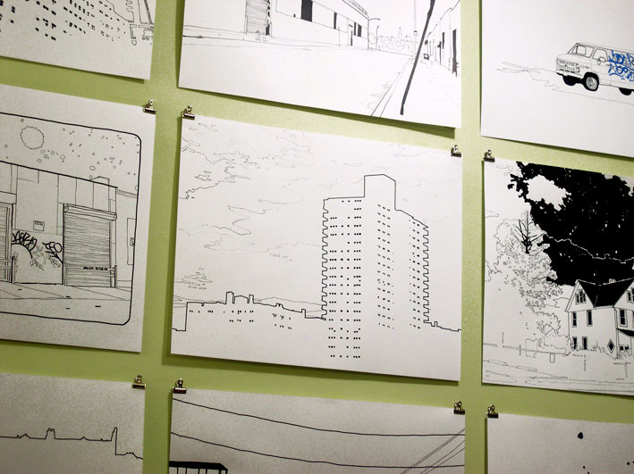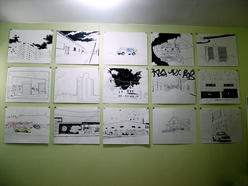 2004. Drawings panel. Marker and color pencils on paper. 170 x 320 cm (15 drawings). Each drawing: 48 x 61 cm.