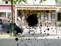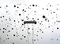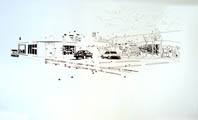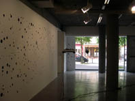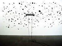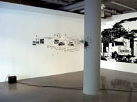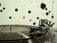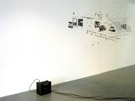 Wall drawings and sonic sculpture, sound, analog loop. Acrylic paint, markers, turntable, guitar amplifier and vinyl record - The